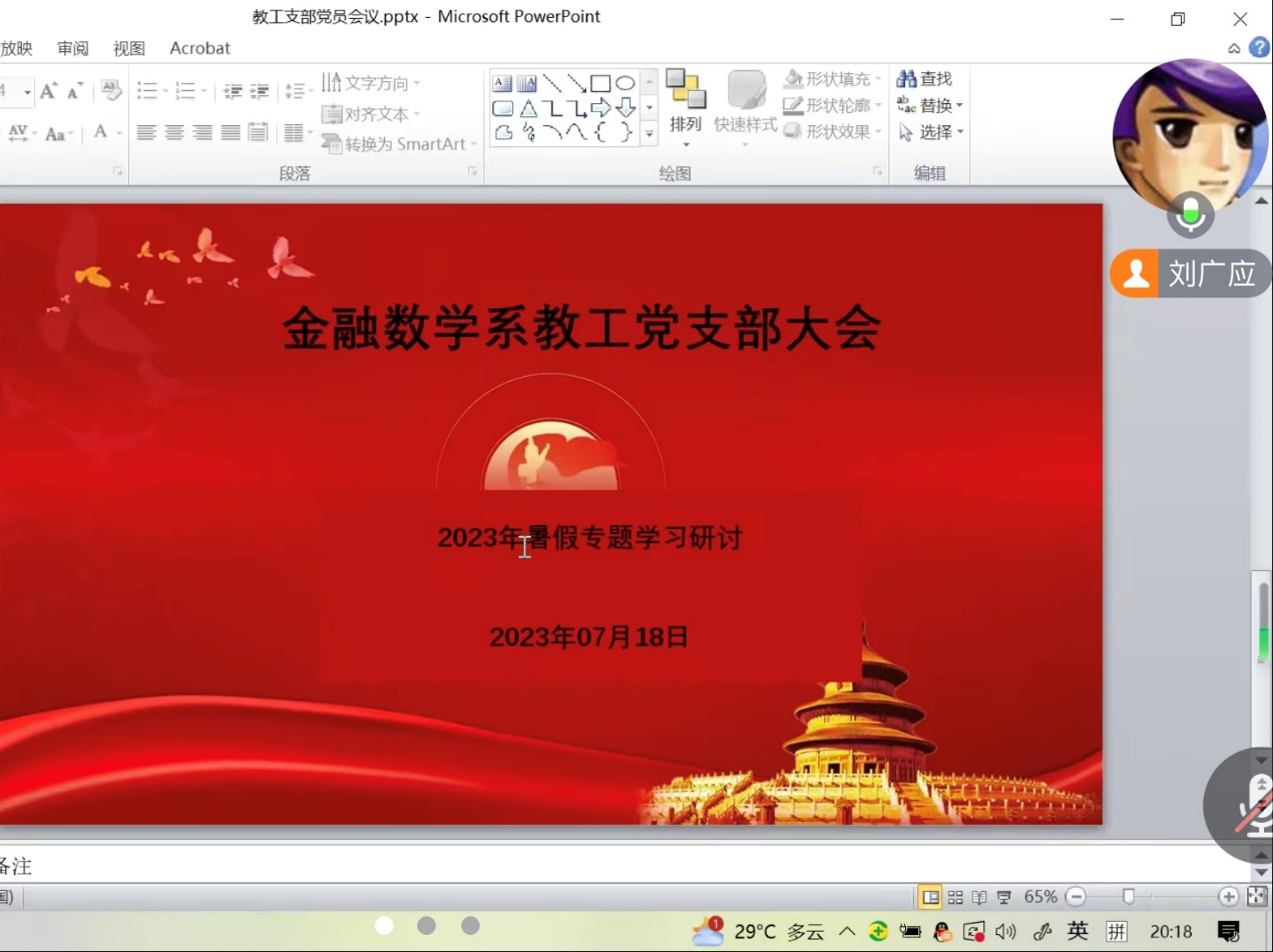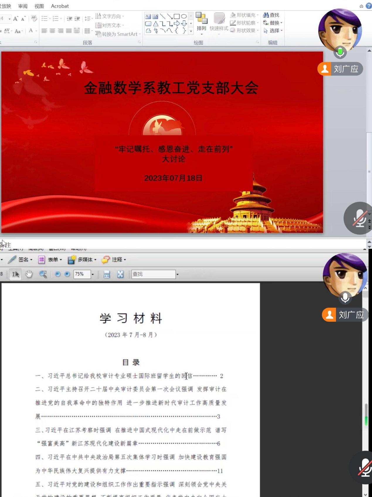 7月18日,金融数学系教工党支部在腾讯会议召开支部党员大会,开展专题教育学习,并结合学习主题开展了“牢记嘱托、感恩奋进、走在前列”大讨论。会议由支部书记刘广应主持。