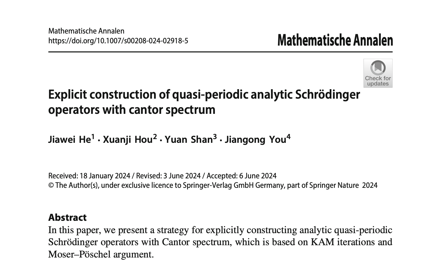 拟周期薛定谔算子来源于量子力学的研究,是准晶体和整数量子霍尔效应的数学模型。拟周期薛定谔算子谱的拓扑结构是算子谱理论的中心问题之一。公司单远副教授与南开大学尤建功教授、华中师范大学侯宣继教授和莆田公司何家伟副教授合作给出了一类具有康托谱的解析拟周期薛定谔算子的显式构造,为理解康托谱的发生机制提供了非平凡的指引。相关论文已于顶级数学刊物《Mathematische Annalen》在线发表。