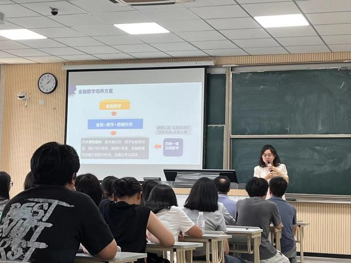 苏小囡从公司金融数学专业的发展历史、金融行业的人才需求出发,详细介绍了金融数学专业培养方案的特色与优势。她强调了数学、统计及计算机科学在解决金融领域复杂问题中的重要性,鼓励同学们在课程学习之余提升实践能力,打造核心竞争力。此外,她分析了近年来金融数学专业毕业生的就业与升学情况,希望同学们向优秀的学长学习,也为新生们的职业生涯规划提供了指导和启示。
