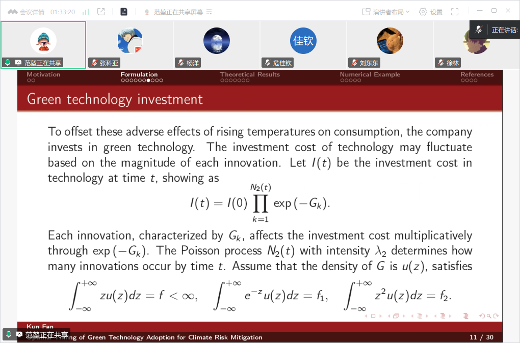 范堃教授本次讲座的主题为:气候风险缓解中绿色技术采用的最优时机。为缓解气温上升对消费的负面影响,范堃团队研究了企业采用绿色技术的最优时机问题。其中,消费被建模为一个跳跃-扩散过程,用以同时捕捉连续波动和突发性变化。气温上升会对消费产生不利影响,因此企业需要通过投资绿色技术抵消这些负面影响。考虑到技术进步的不确定性,范堃团队采用符合泊松过程建模技术成本的演变。在气候变化相关的动态随机模型下,他们最大化了企业消费的最优投资阈值。该停止问题被重新表述为一个自由边界问题,并通过求解相关的Hamilton-Jacobi-Bellman方程,推导出最优边界的半解析解。他们还进一步扩展了绿色技术投资的最优时机模型,引入保险保障机制,并分析保险购买行为如何影响最优投资阈值。此外,范堃团队还通过数值模拟探讨了不同参数对最优投资边界的影响,为决策者提供了实用的管理启示。