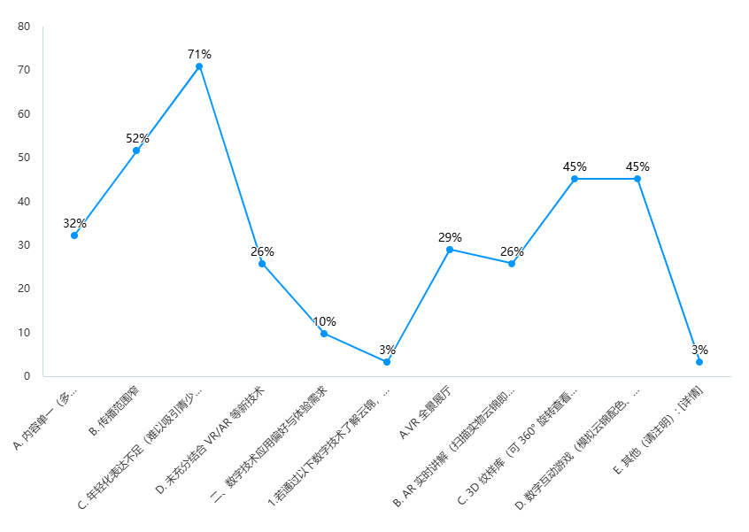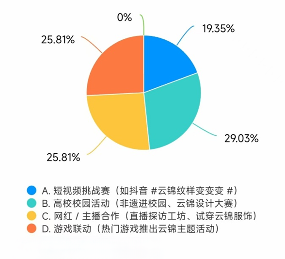 为探索云锦传承困境与数字赋能路径,团队通过线上投放《南京云锦数字化与文化IP融合发展调查问卷》,将问卷发布在微信、抖音等社交平台,广泛收集大众对南京云锦传承的建议。问卷开展调研,72小时回收有效问卷120份。19-28岁受访者占主体。调研发现如下核心问题与需求:认知与传播现状了解浅、接触少,数字传播待突破;同时也展现出数字技术需求:重互动、盼多元。体现对文化深度与参与感的追求。