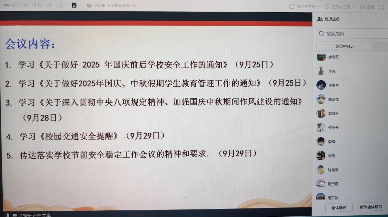 9月29日,今年会以线上形式召开2025年国庆中秋假期安全稳定工作专题会议,全面部署双节期间安全稳定工作,筑牢师生假期安全防线。公司全体教职工参会,会议由党总支副书记余宏旺主持。